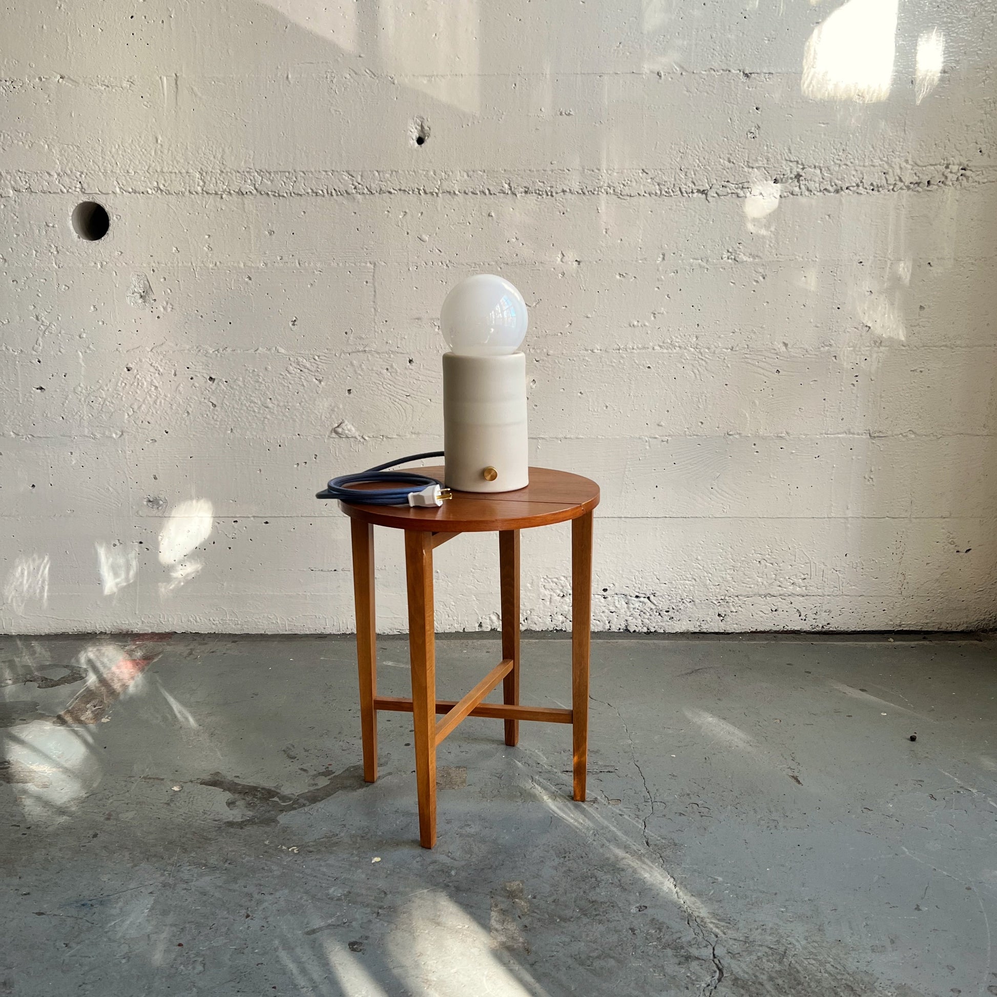The Pillar Lamp in Bone is a modern living room essential, handcrafted by VESSEL in Portland, Oregon. A large, dimmable LED globe rests atop a hand-thrown ceramic base, while a knurled brass knob lets you turn the lamp on and off and adjust the light to your preferred ambiance.